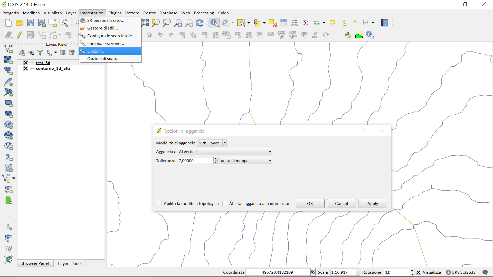 questo nuovo shapefile è predisposto per la terza dimensione (z- dimension -4), attiviamo la modifica e configuriamo gli snap (come visto sopra) ed iniziamo a tracciare una linea: