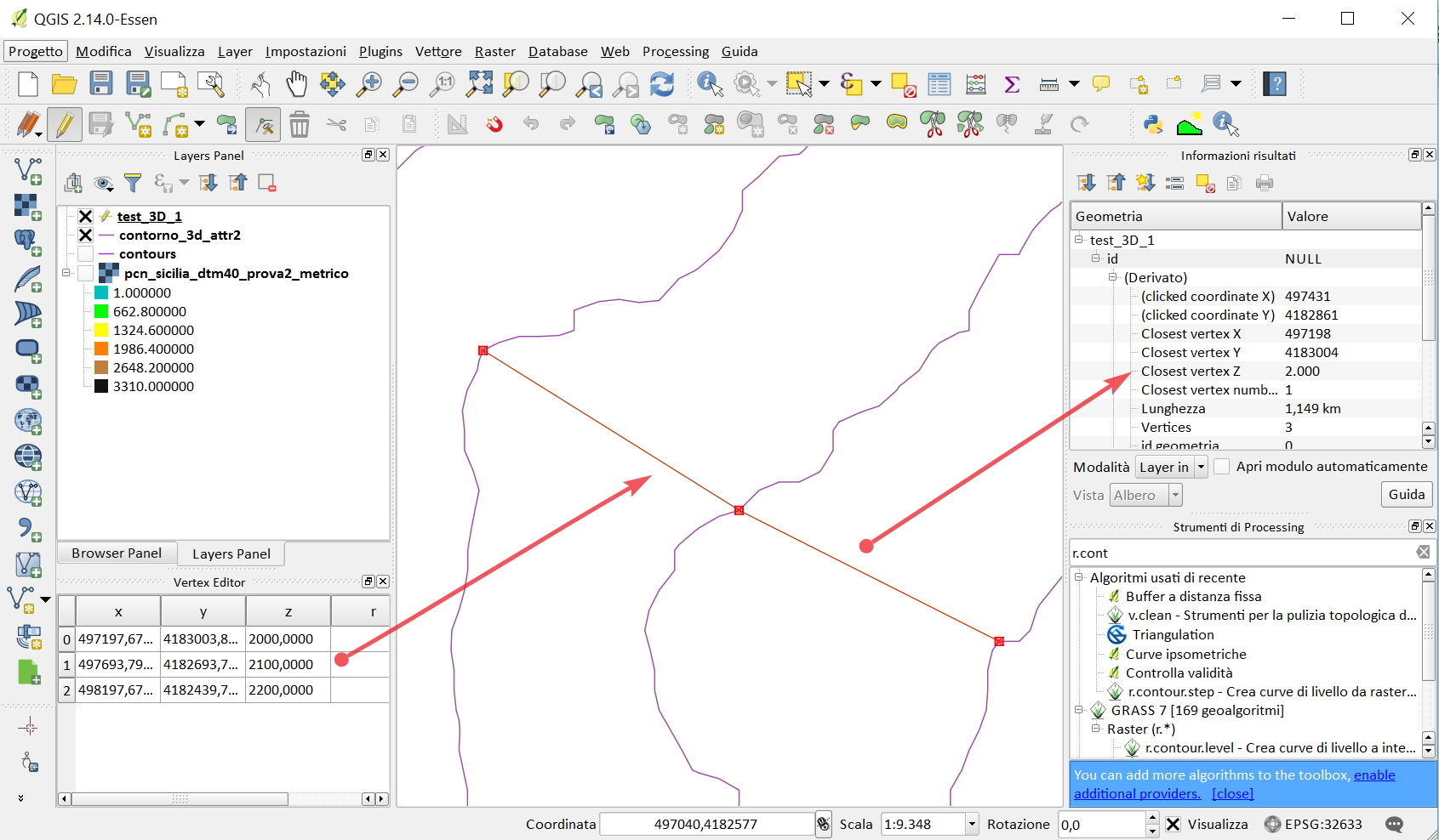 è possibile constatare, sia dal Vertix editor sia dalla info, che i vertici della linea hanno le tre coordinate. 🙂