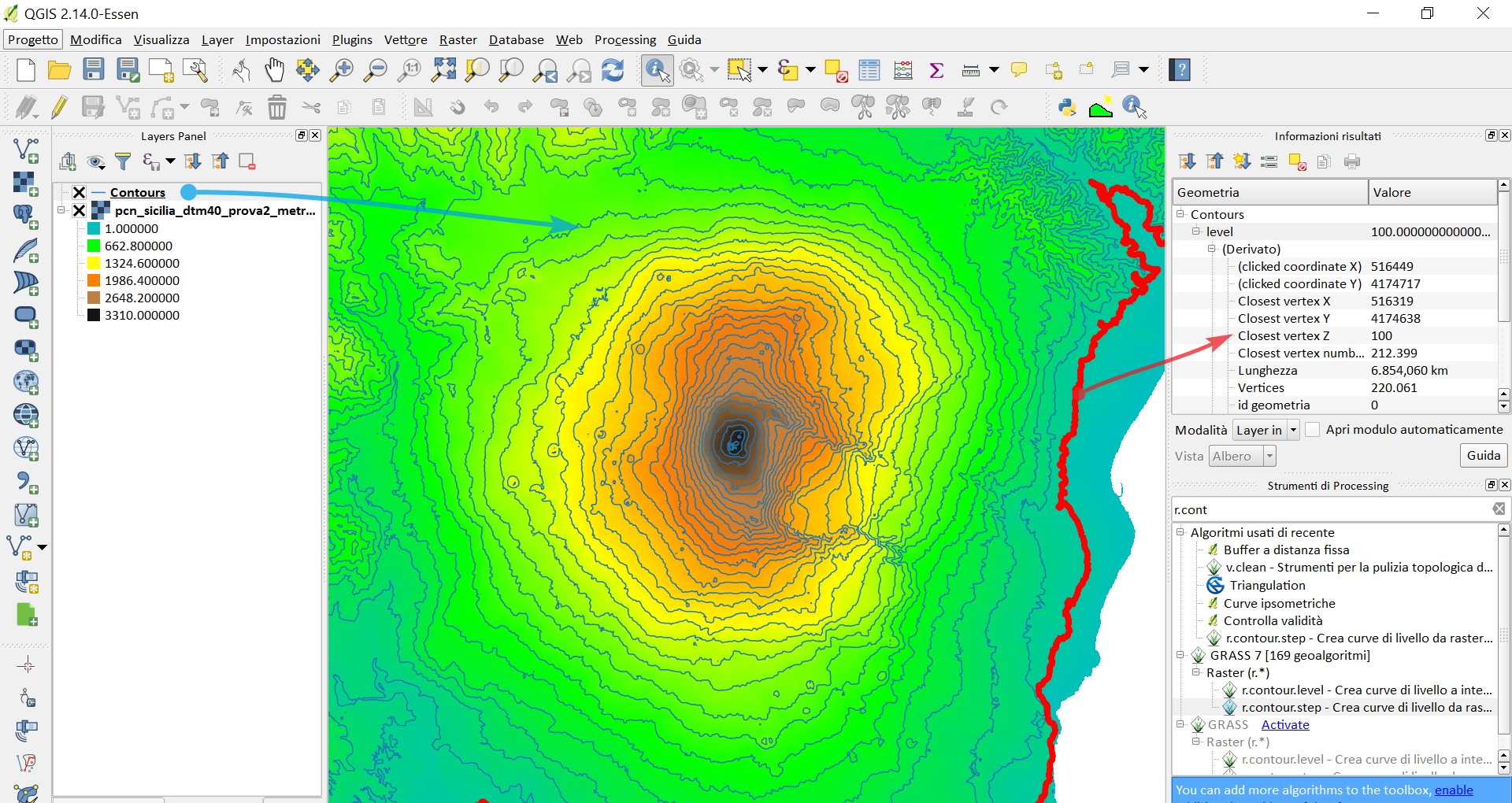 Per creare rapidamente uno shapefile 3D carico un DTM (quello della Sicilia 40 m/px) e attraverso il processing lancio il comando GRASS r.contour.step che ci permette di creare le curve di livello direttamente in 3D: