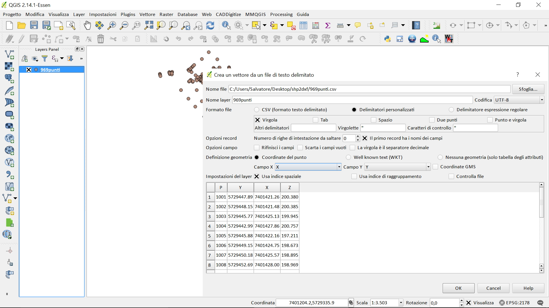 importiamo il file CSV tramite ‘aggiungi layer testo delimitato’: