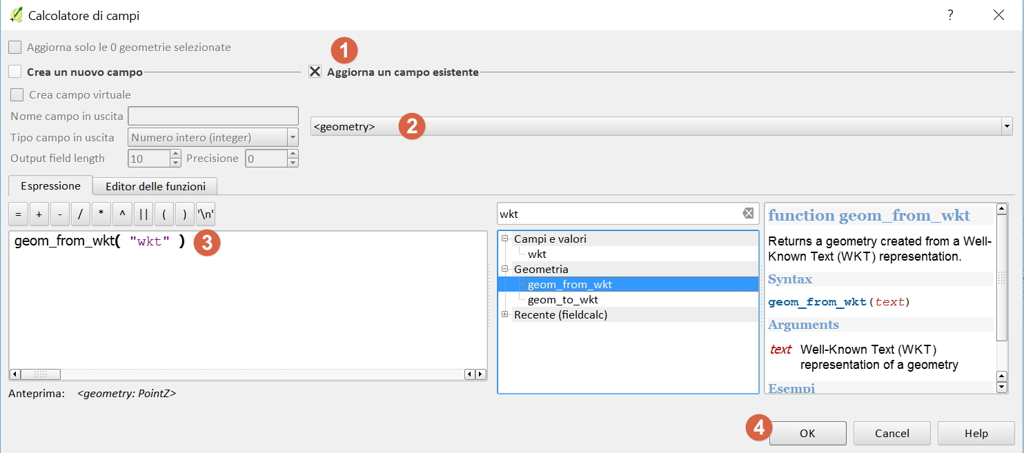 note finali: questo procedimento è valido per i soli punti in quanto il calcolatore di campi, e quindi il relativo shapefile, può contenere al massimo 254 caratteri.(questo limite si superare per altre tipologie di geometrie, in questo caso è utile usare un vettore spatialite, che non ha limiti).