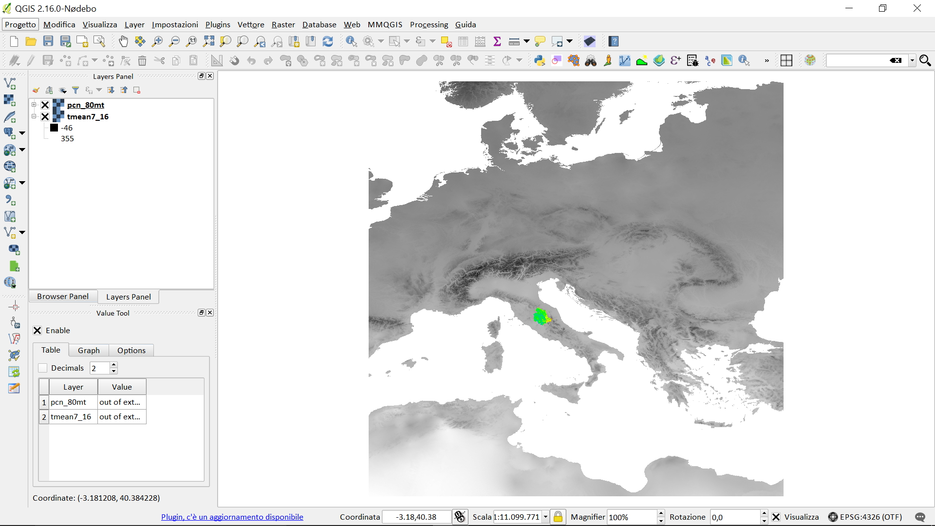 2. tmean7_16 Europa (temperatura media europea) EPSG 4326, pixel 30 arc-seconds, cioè circa 1000 m/px;