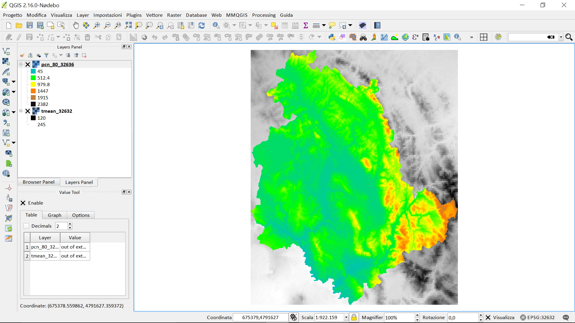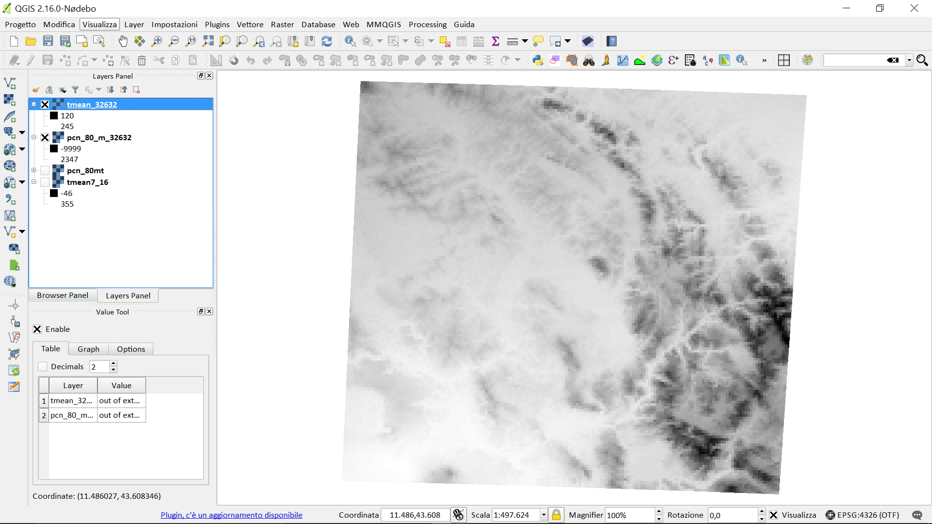 i due raster importati in QGIS (tmean7_16 e DTM Umbria)