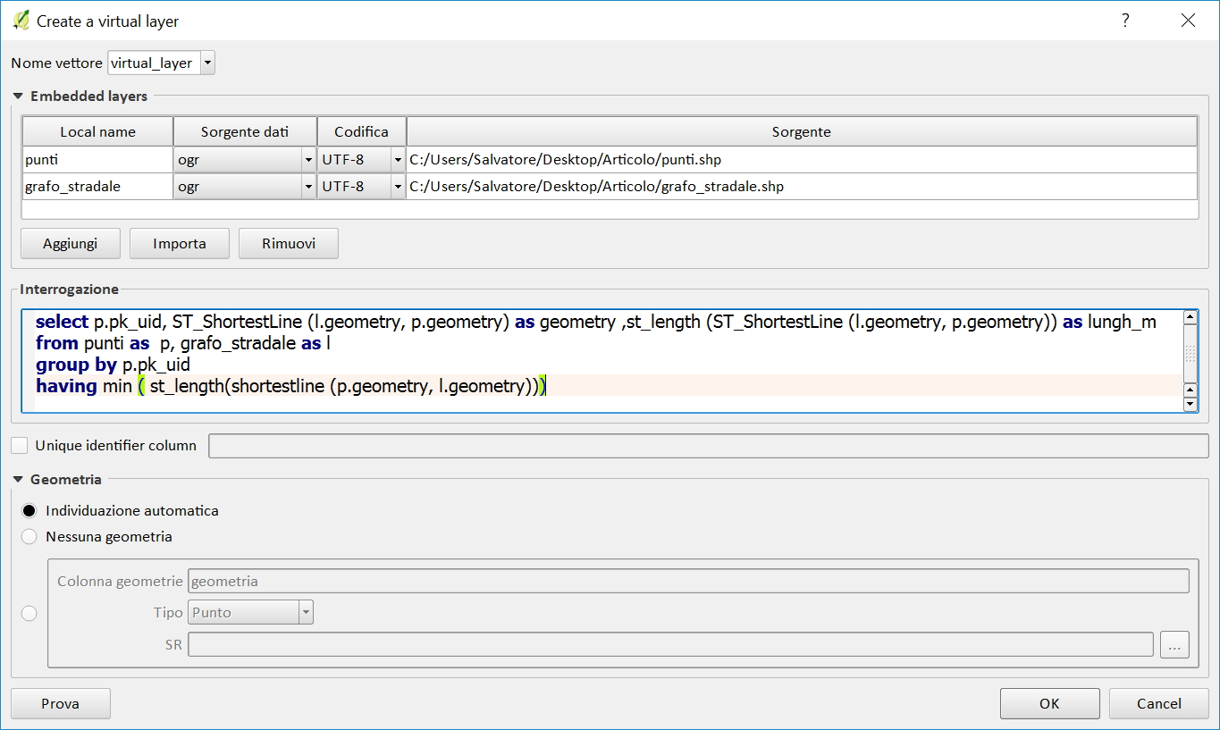si aprirà una maschera, importare i due layer presenti nella TOC e scrivere il seguente script SQL (NB: occorre personalizzare ID, che nel caso specifico è pk_uid):