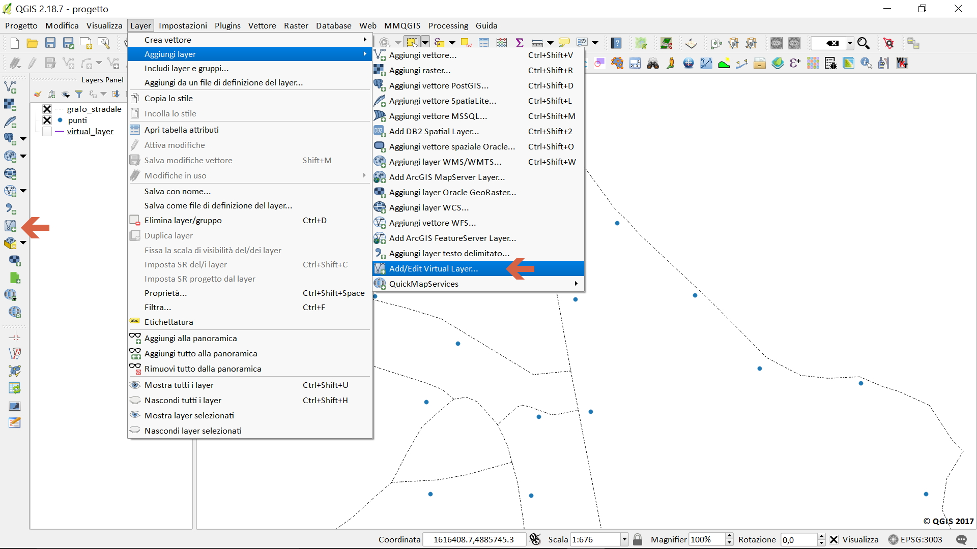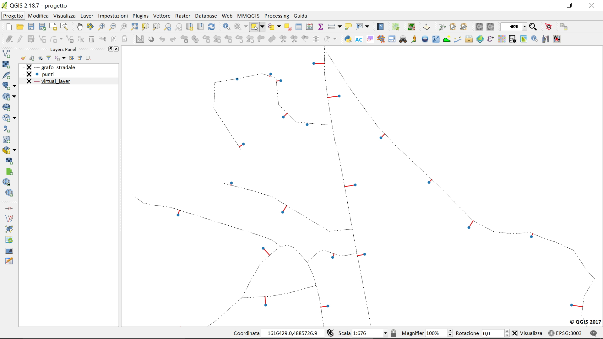 Prenderò come esempio gli assi stradali (layer: grafo_stradale) e dei punti della pubblica illuminazione (layer: punti):