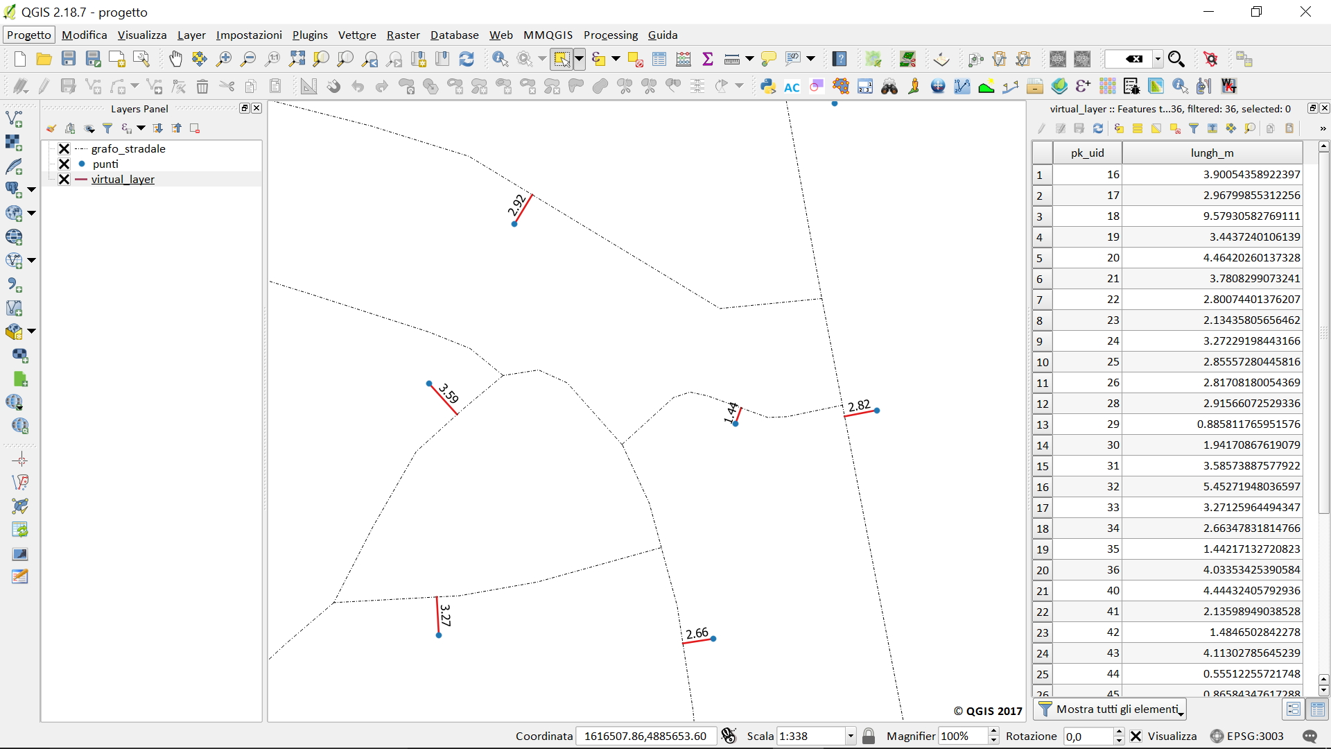 nello script di sopra viene calcolata anche la lunghezza del segmento minimo (cosa superflua, in quanto QGIS lo fa anche etichettando) che comparirà nella tabella attributi del virtual layer: