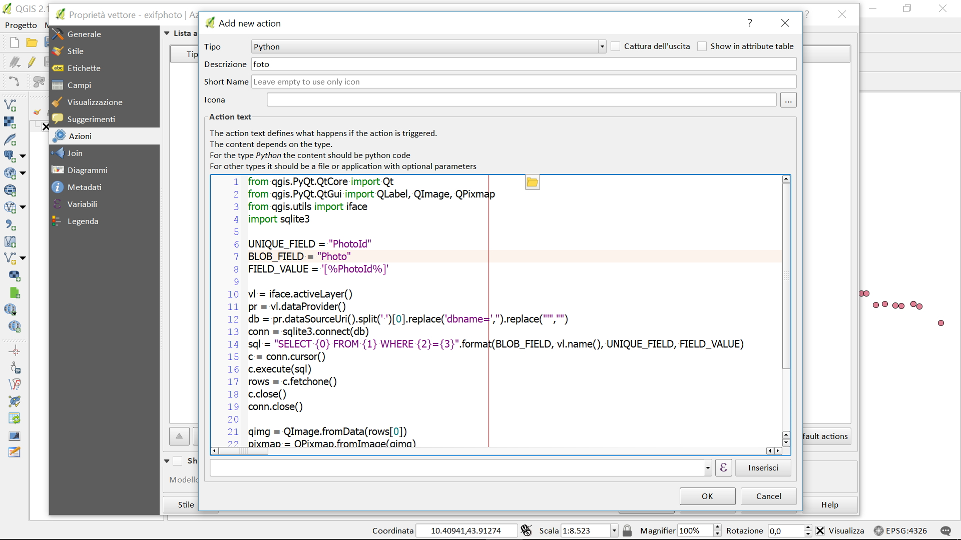 Note finali: personalmente non trovo utile caricare le foto in un database perchè appesantisce e rallenta il tutto; ma saper che è possibile, tramite una semplice azione Python, visualizzare delle foto in QGIS, lo rende sempre più completo.