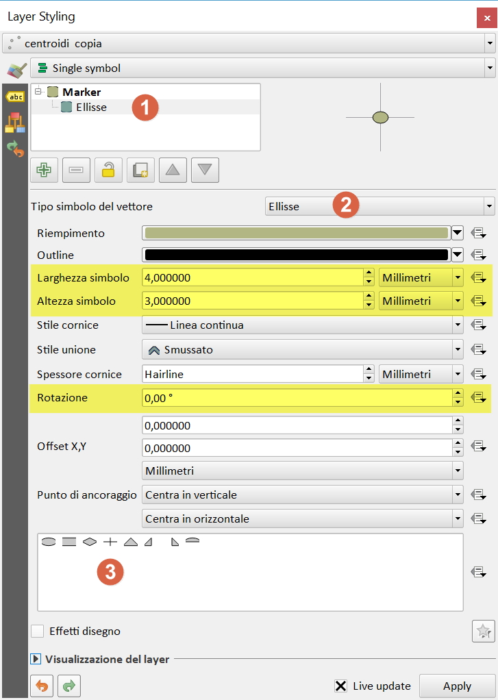 In QGIS l’unica tipologia di simbolo del vettore che mette a disposizione molti parametri di configurazione (altezza, larghezza, ecc…) è ‘Ellisse’: