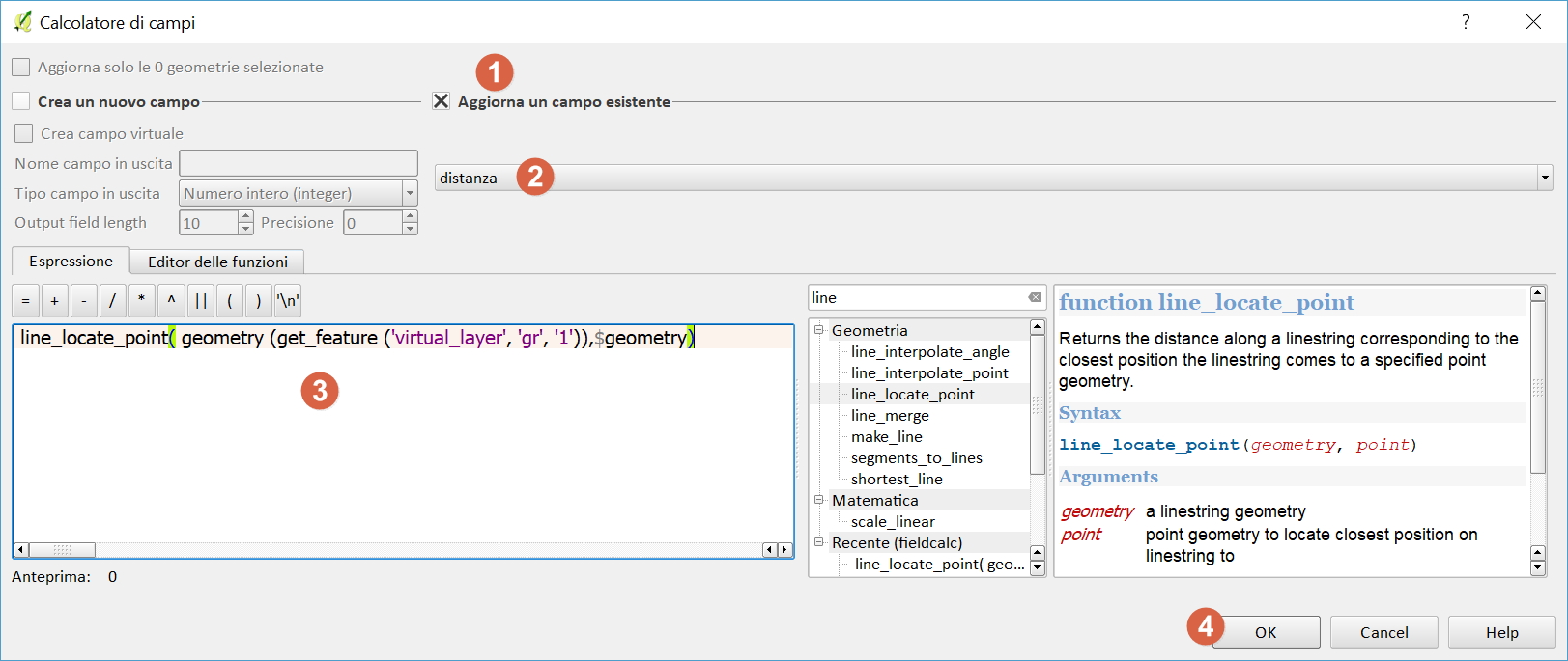 realizzata la linea, possiamo popolare il campo ‘distanze’ usando il calcolatore di campi nel layer puntuale ‘vert’:
