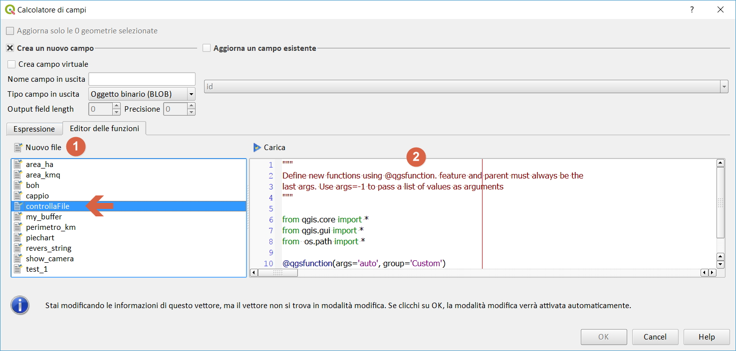 selezionare il tab ‘editor delle funzioni‘, cliccare su ‘nuovo file‘ (dare un nome a piacere) e incollare lo script python di sopra, infine carica.