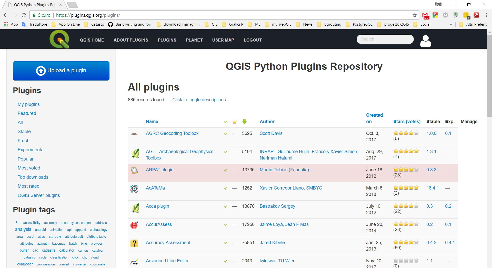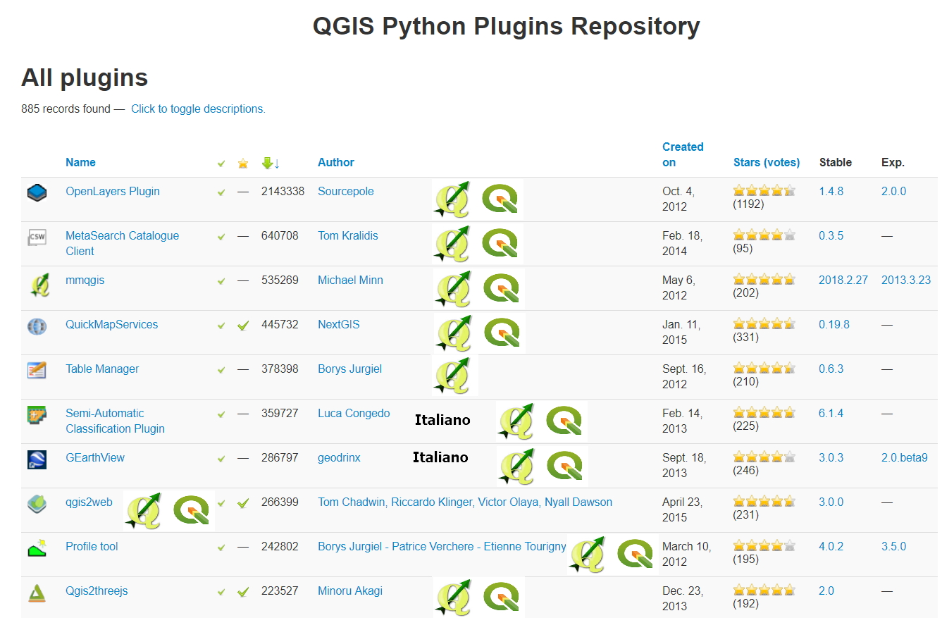 La stragrande maggioranza dei plugin si trovano nel repository, purtroppo non è possibile distinguerli per versione software (tra 2.x e 3.x) ma ci sono varie possibilità per la ricerca: tramite categoria (Featured, All, Stable, Fresh, Experimental, Popular, Most, voted, Top downloads, Most rated, QGIS Server plugins) oppure tramite tags; ogni categoria si puo’ ordinare per nome, per autore, data di creazione, numero di download ecc..;