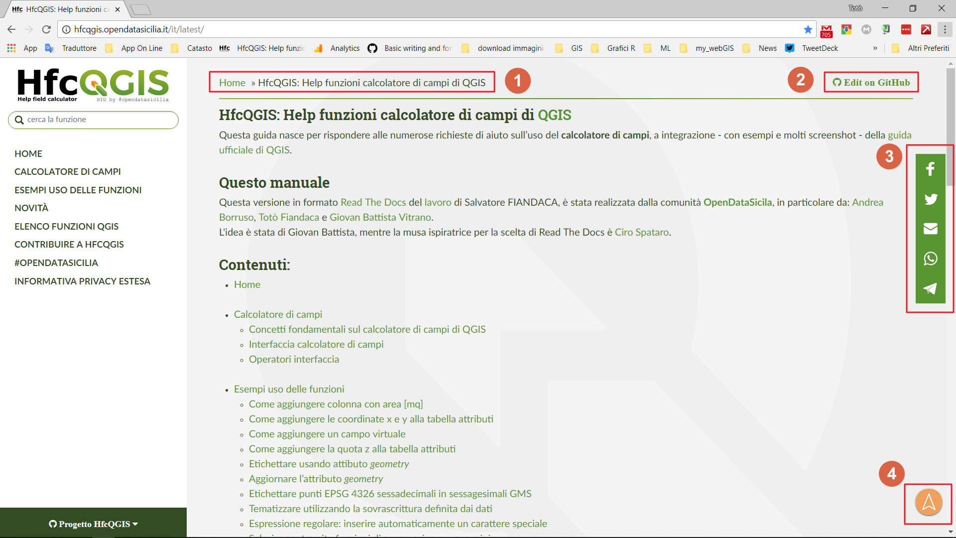 - in alto a destra il tasto GitHub che permette di collegarsi direttamente al file, nel repository, della sorgente della pagina; molto utile per segnalare problemi ed altro;