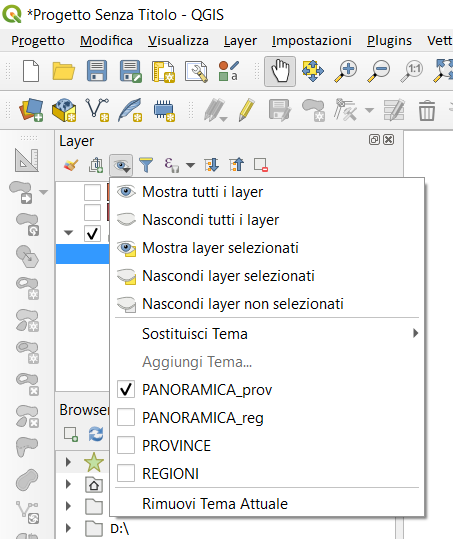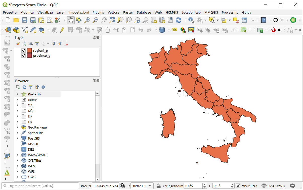 Iniziamo caricando in QGIS due strati: regioni e province ISTAT.