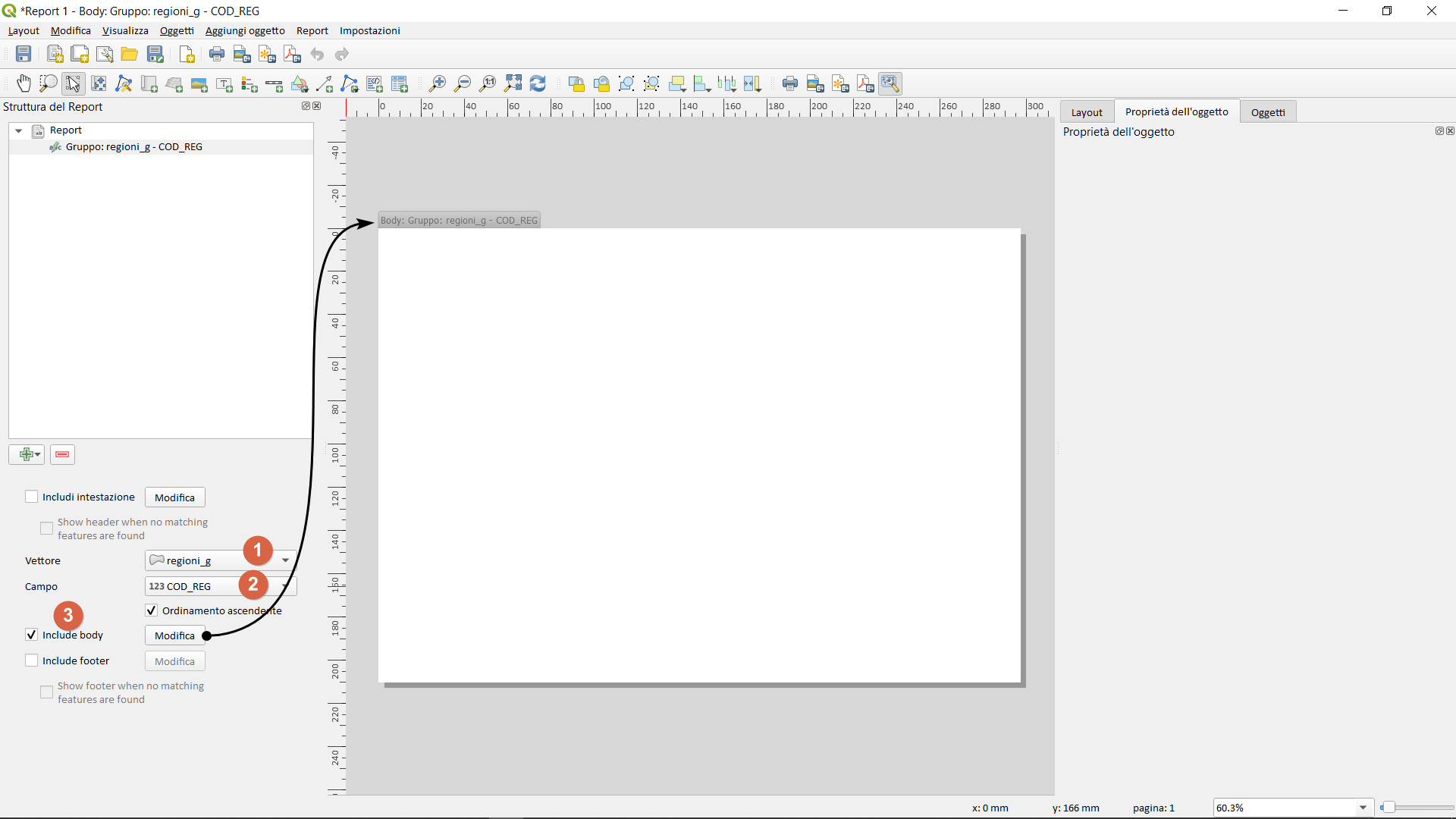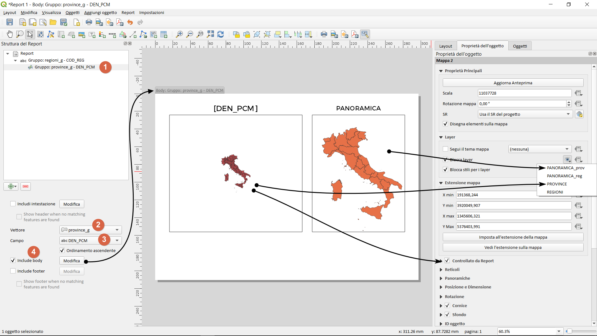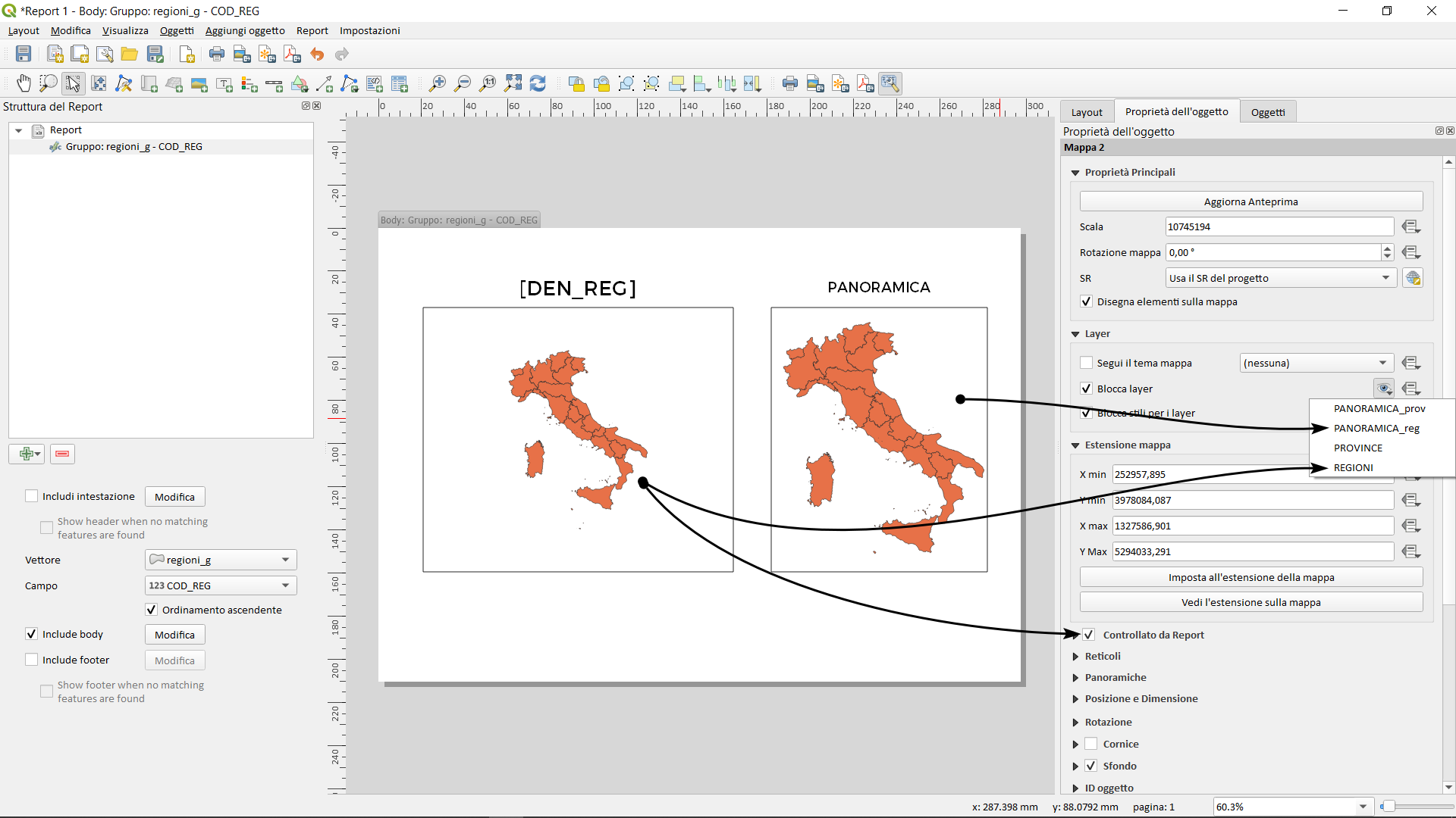 Il primo vettore di coperture creerà tante pagine quante sono le regioni e il secondo creerà tante pagine quante sono le province, ma questi due vettori sono tra loro legati dal campo COD_REG (è un legame che interpreta QGIS e i report, non occorre far altro) che ci permetterà di incrociare le pagine delle regioni con quelle delle province. Naturalmente è possibile aggiungere altre pagine come l’intestazione o il piè di pagina, ma questo è descritto nel mio primo blog post sui report.