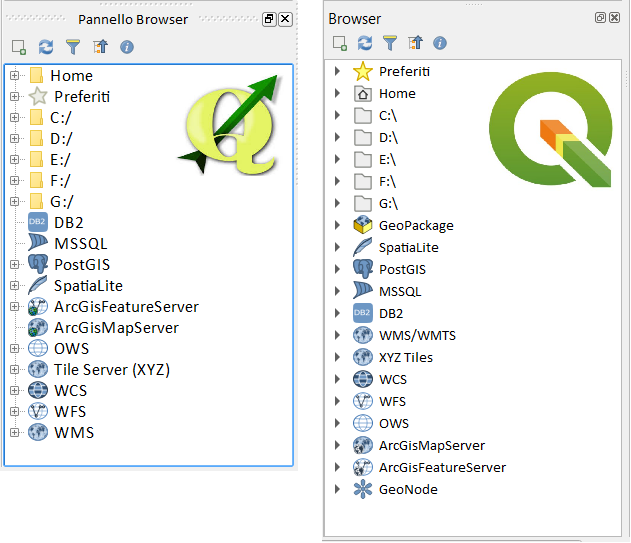 QGIS Browser è disponibile come applicazione stand-alone (fino alla 2.18) e come pannello in QGIS Desktop. Ci consente di navigare facilmente nel nostro disco e gestire i dati geografici. È possibile avere accesso a file vettoriali comuni (ad es. gli shapefile ESRI o i file MapInfo), GeoPackage, database (ad es. PostGIS, SpatiaLite, MS SQL Spatial, DB2), OWS / WCS | WMS | WFS, XYZ Tiles, ArcGisMapServer, ArcGisFeatureServer e GeoNode. È inoltre possibile visualizzare i dati GRASS (per ottenere i dati in QGIS, vedere Integrazione con GRASS GIS).
