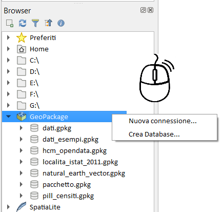 Cliccando con il tasto destro del mouse su GeoPackage potremo fare: una Nuova connessione ad un geopackage esistente, oppure, creare un nuovo geopackage;