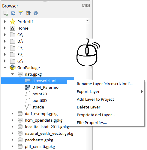 tasto destro su un vettore del geopackage possiamo: rinominare il vettore; esportarlo come file (si avvia il salva con mone di QGIS); aggiunge il vettore al progetto; cancella il vettore dal geopackage; avvia il widget delle proprietà del vettore (molto utile perché visualizza i metadadi, la tabella attributi e la geometria); infine proprietà del file (stile windows):