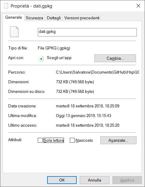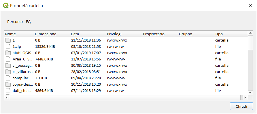 tasto destro su una cartella possiamo: creare una nuova cartella, un nuovo geopackage o uno shapefile; nascondere la cartella nel browser; fare una scansione veloce; aprire la cartella; aprire la cartella da terminale (nel caso di windows avvia il dos); aprire finestra proprietà della cartella visualizzato tutte le sottocartelle e file; infine apre finestra proprietà della cartella (stile windows):