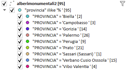 L’output, di questo lungo lavoro certosino, è un file CSV con #19 campi e oltre #2000 record; tra i vari campi sono presenti le coordinate longitudine, latitudine (in EPSG 4326) che permettono di visualizzare – per esempio con QGIS – i pallini degli alberi monumentali d’Italia.