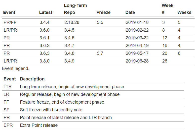 LTR è l’acronimo di Long Term Release (Versione a lungo termine) è una versione, rilasciata ogni 3/4 versioni, che viene sviluppata e mantenuta (con aggiornamenti, correzione di bux e backport) per due anni dal rilascio. La prima LTR nacque nel 2015 con la 2.8 Wien e durò solo un anno e venne sostituita, nel 2016, dalla 2.14 Essen, anch’essa per un solo anno; a partire dalla 2.18 Las Palmas la LTR è stata in carica per due anni.