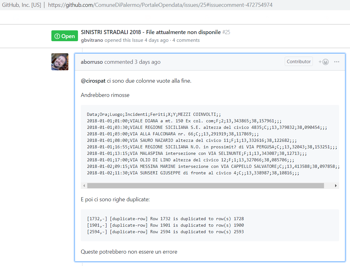 infatti Andrea Borruso ha subito segnalato i problemi con una issue nel repository GitHub del Comune: