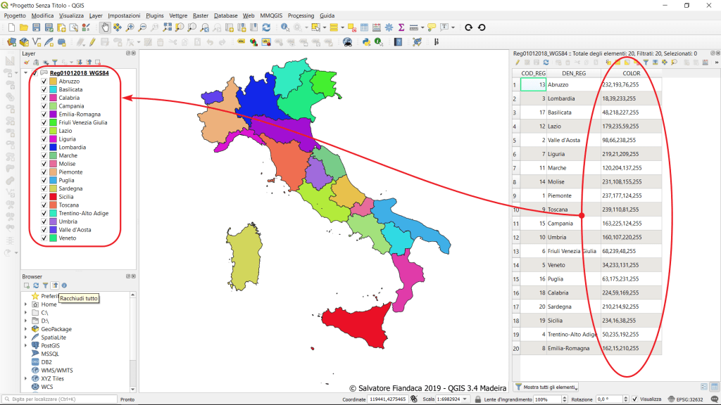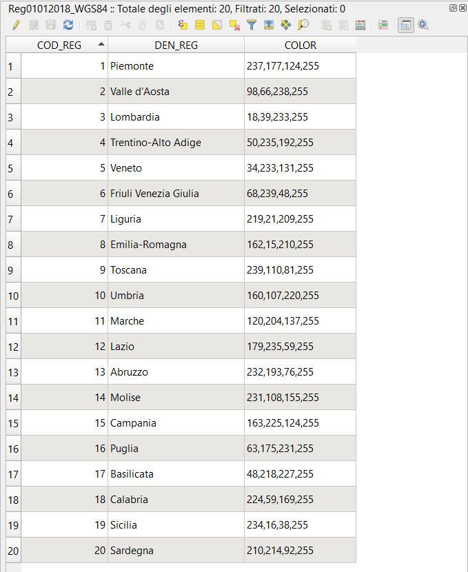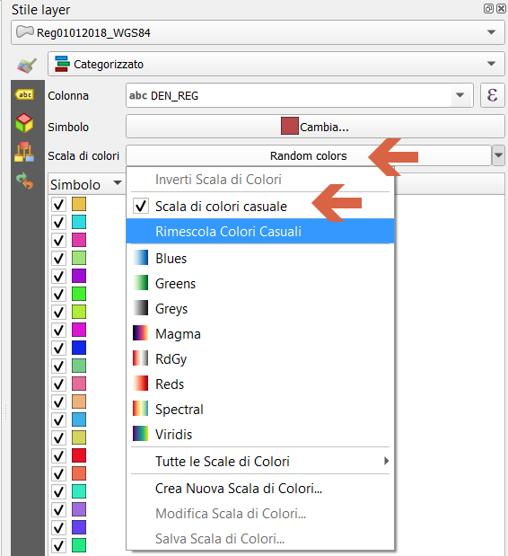 e ci comunica che ha tematizzato (metodo categorizzato) utilizzando il campo “DEN_REG” e i colori usati si trovano nella colonna “COLOR” (io penso, poteva allegarmi anche il file qml e facevo prima; ma l’amico non ha creato oppure ha cancellato il file QML e non sa più come ricrearlo).