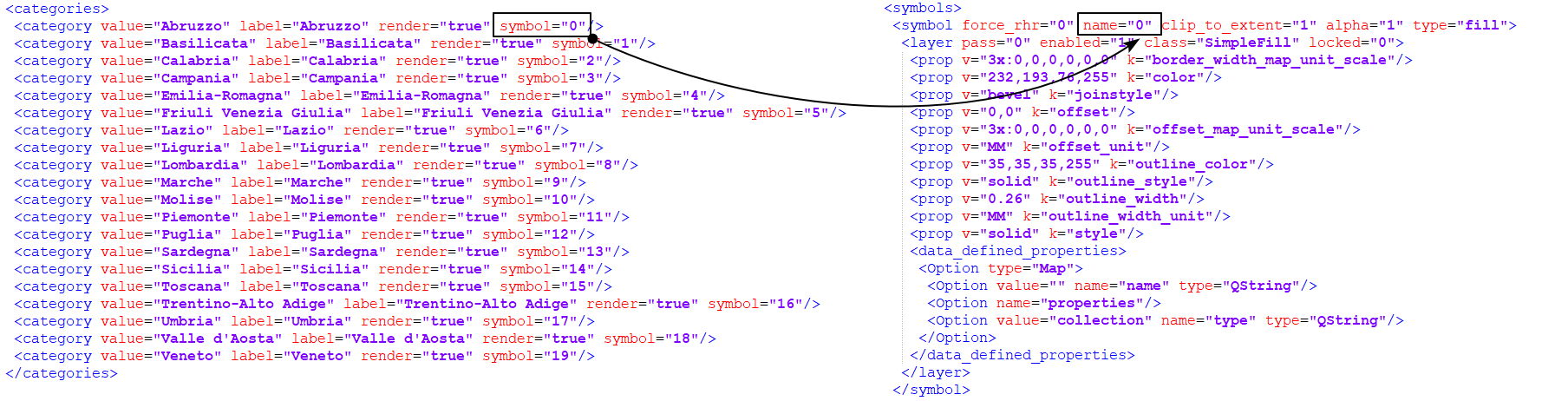 NB: la struttura del file QML è complessa e occorre sottolineare che gli attributi, secondo cui si tematizza il layer, vengono memorizzati in due modi diversi: come valore dell’attributo e come valori interi da 0 a n; questo valore intero viene memorizzato nel tag name: