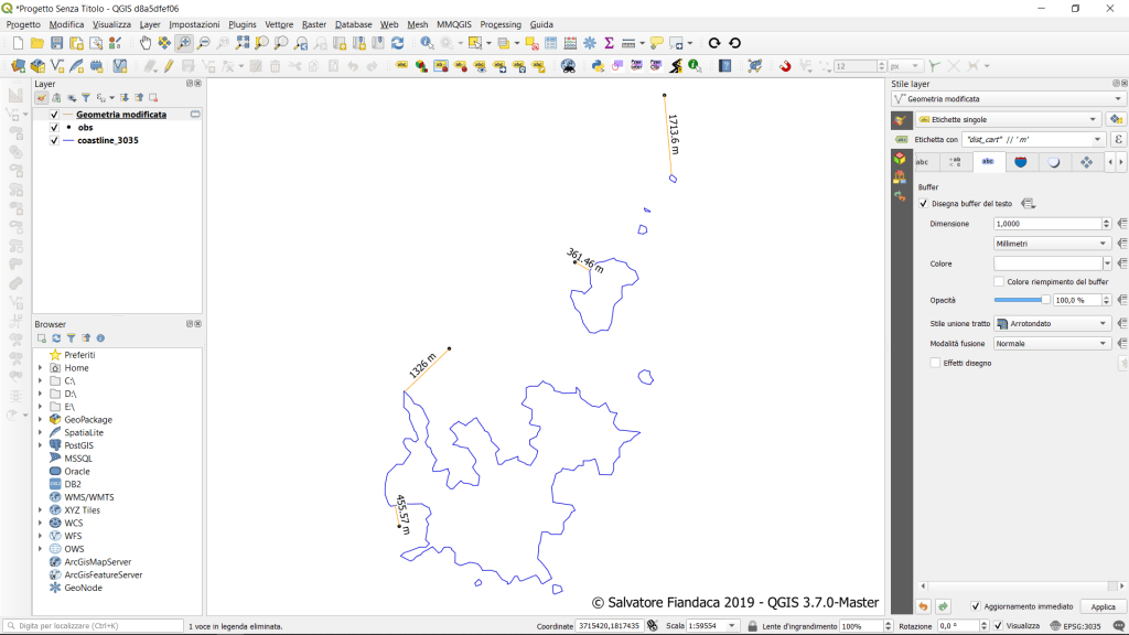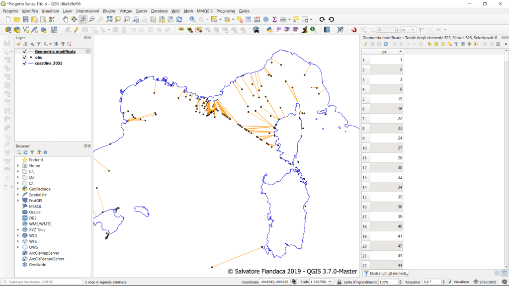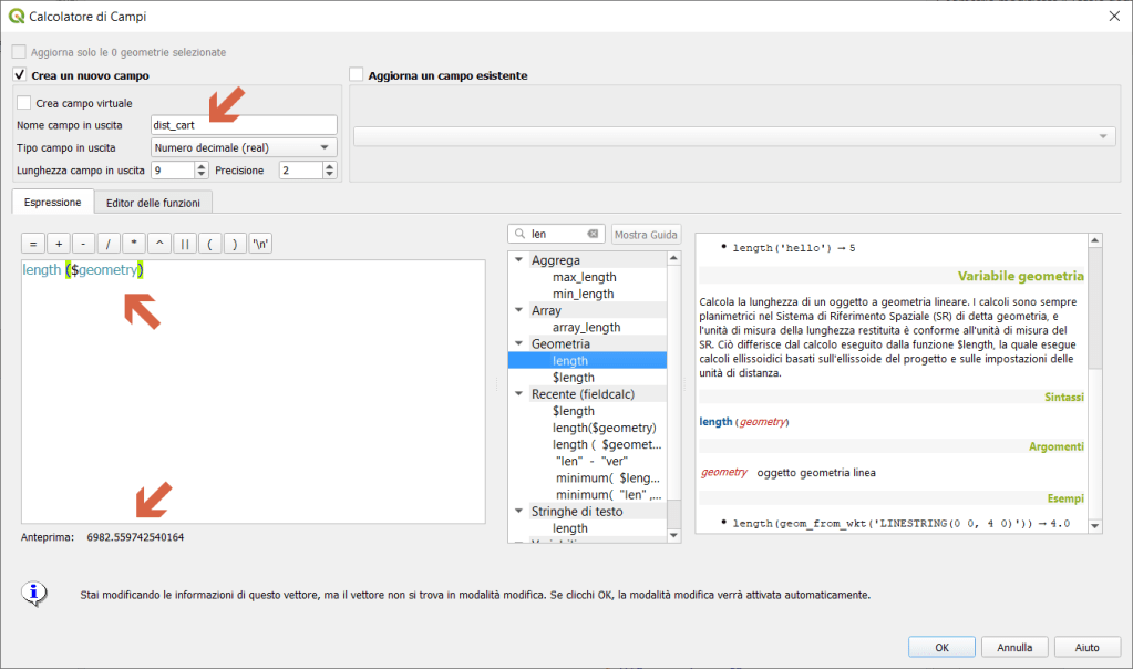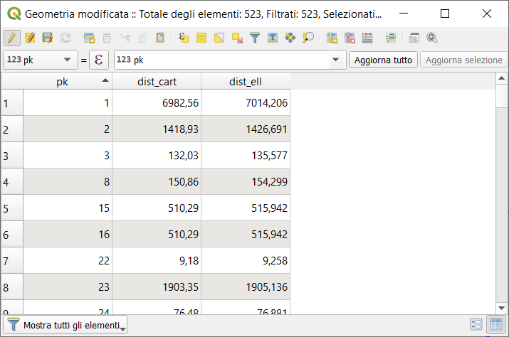 Calcolo delle distanze cioè lunghezza dei segmenti appena creati: aggiungo due campi ‘dist_cart‘ (distanza cartesiana) e ‘dist_ell‘ (distanza ellissoidica):