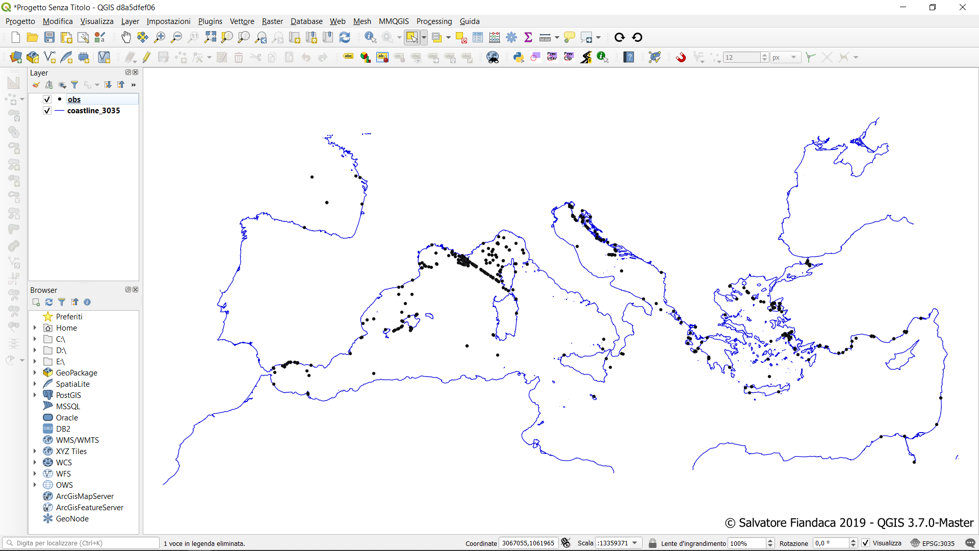 due layer: le coste europee e un file puntuale, determinare la distanza minima dei punti rispetto alla costa (e tracciare il segmento).