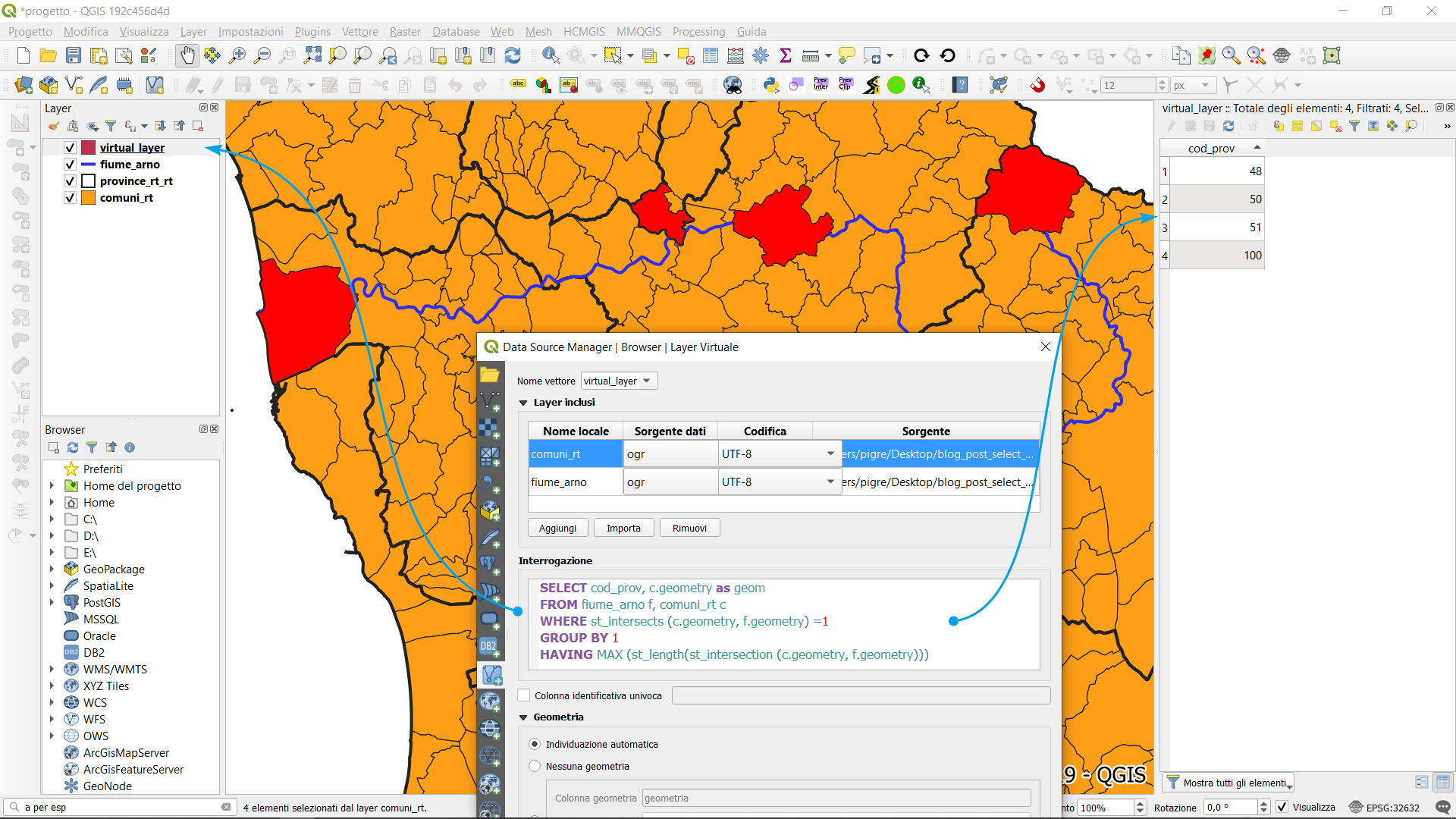 due layer (comuni_rt e fiume_arno): selezionare i comuni – uno per ogni provincia, che contengono il tratto più lungo del fiume Arno.