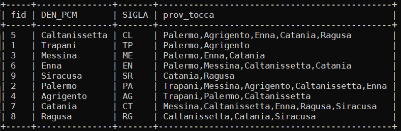 La quarta colonna (prov_tocca) di questa tabella (sicilia.csv ) contiene i nomi delle province che toccano la provincia corrente presente nella seconda colonna (DEN_PCM), cioè Caltanissetta è confinante (toccata spazialmente) con le province di: Palermo, Agrigento, Enna, Catania e Ragusa.