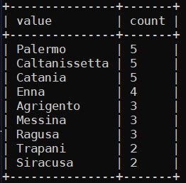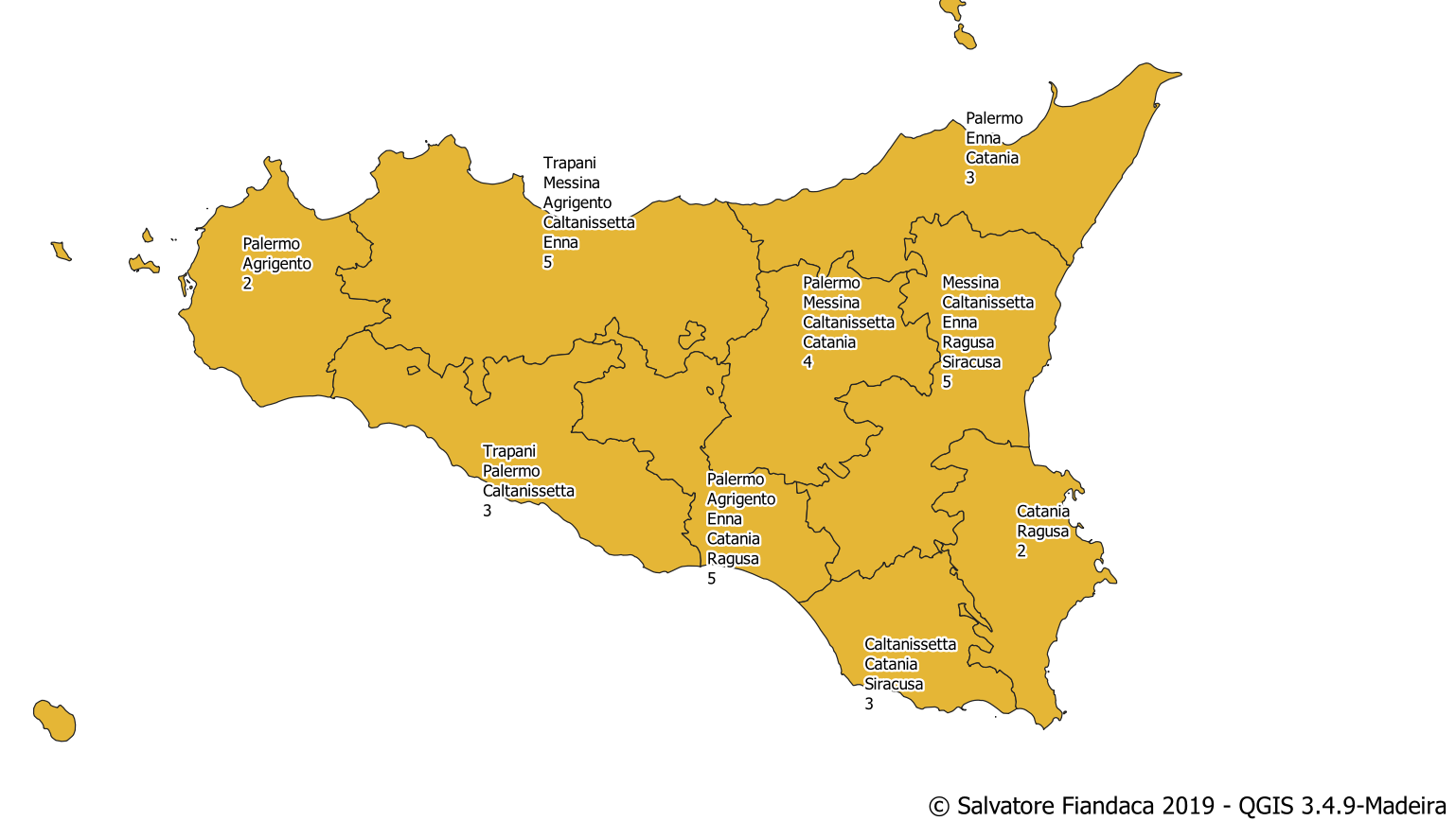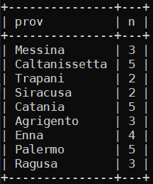 cioè la provincia di Messina è presente tre volte nel campo ‘prov_tocca‘ della prima tabella; Caltanissetta è presente 5 volte e cosi via per le altre province.