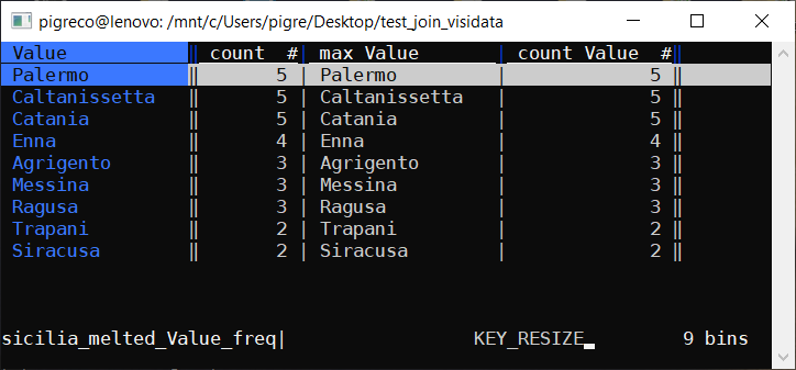 L’amico curioso mi chiede: quante volte è presente il nome Palermo nel quarto campo (prov_tocca)?? In questo caso specifico la risposta è banale, ma il quesito generale è: Conteggi aggregati di campi con multivalore: in generale i valori presenti nel secondo campo sono diversi da quelli presenti nel quarto campo.
