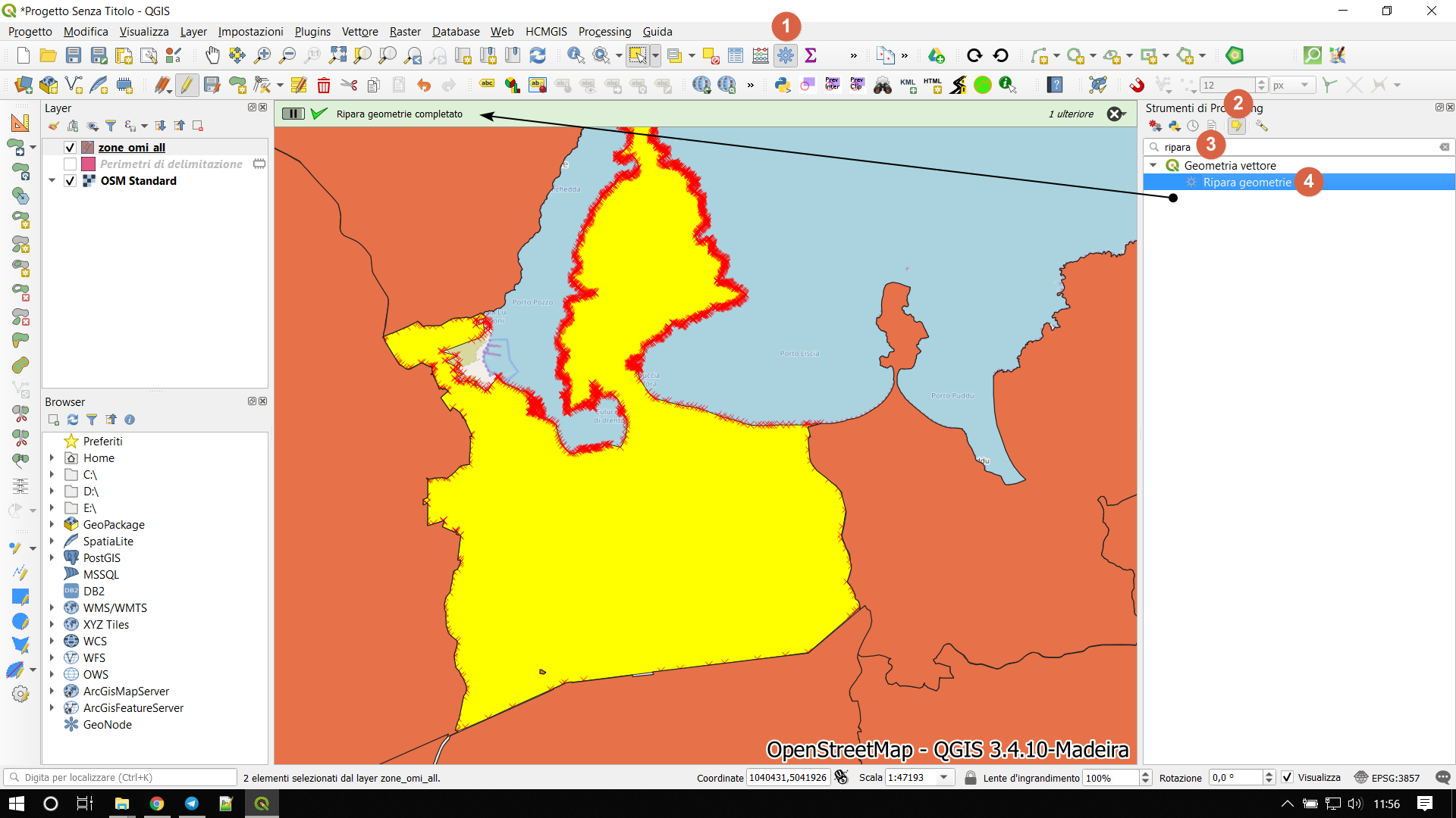 - cerco il geo-algoritmo ‘Ripara geometrie‘ (ST_MakeValid di PostGIS)