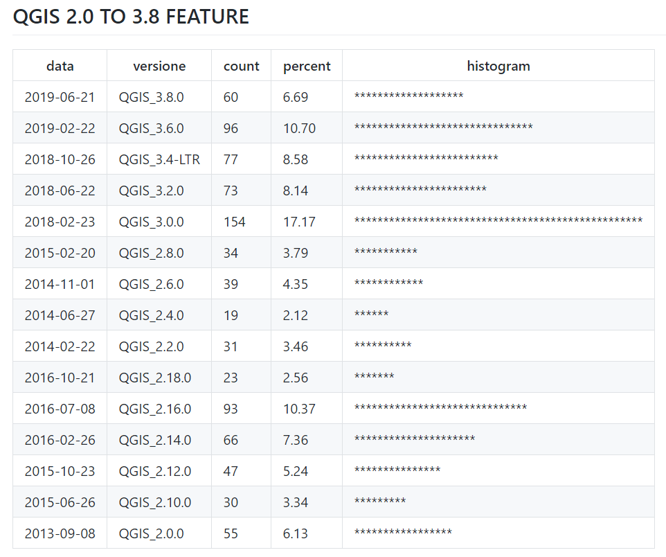 A partire dalla QGIS 2.0 (sett-2013) ad oggi QGIS 3.8 (giu-2019) sono state introdotte, in 6 anni, quasi 900 nuove caratteristiche, di queste oltre la metà negli ultimi 2 anni (cioè dalla 3.0 in poi).