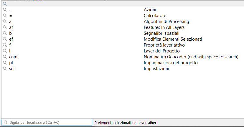 A partire dalla QGIS 3.0 Girona è possibile ricercare qualsiasi cosa con l’uso del Locator Bar (Ctrl+k)