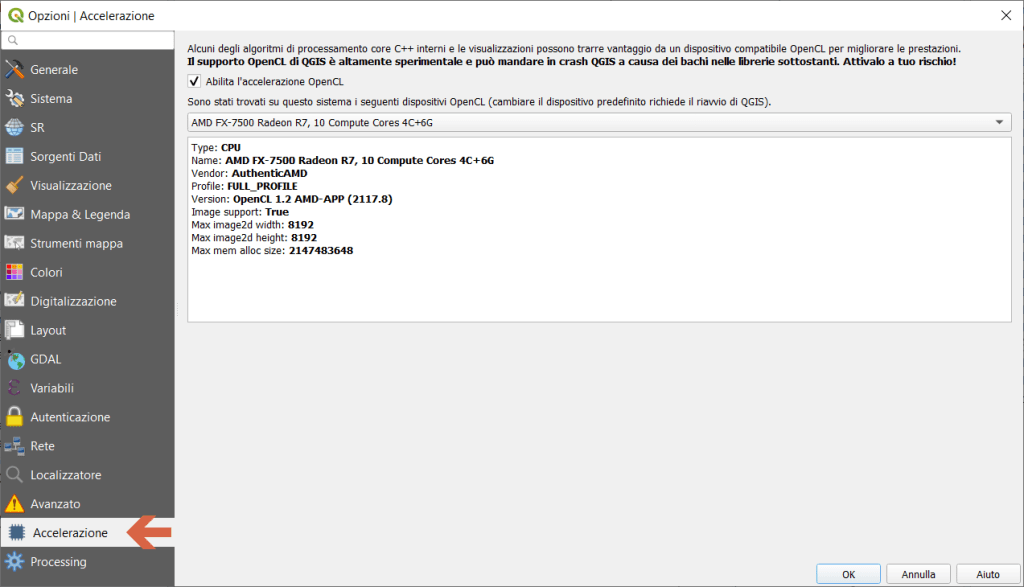 A partire dalla QGIS 3.4 ltr Madeira è possibile attivare l’accelerazione OpenCL per velocizzare alcuni processi e visualizzazioni.