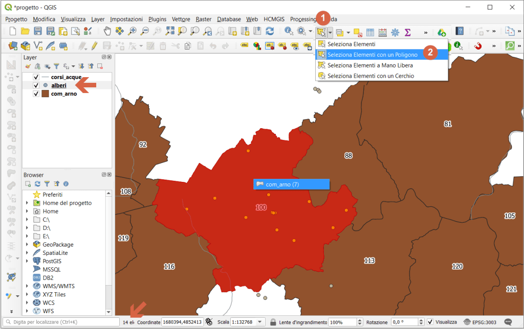 A partire dalla QGIS 3.4 ltr Madeira è possibile selezionare velocemente gli elementi di un layer tramite un poligono di un altro layer (tenendo premuto Alt si attiva predicato contains, altrimenti è Intersects):