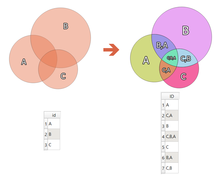 Nell’esempio di sopra, da un insieme di tre cerchi sovrapposti a un insieme di sette poligono non sovrapposti e con gli attributi di provenienza.