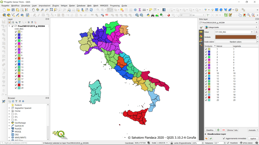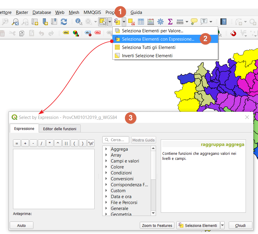 Vediamo come etichettare solo i poligoni appena selezionati con nome provincia e numero sequenziale rispetto all’estensione:
