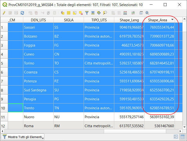 per selezionare le prime 10 province più estese, potremmo ordinare la colonna Shape_Area in senso decrescente (cliccando sull’intestazione della colonna) e poi selezionare manualmente le prime 10: