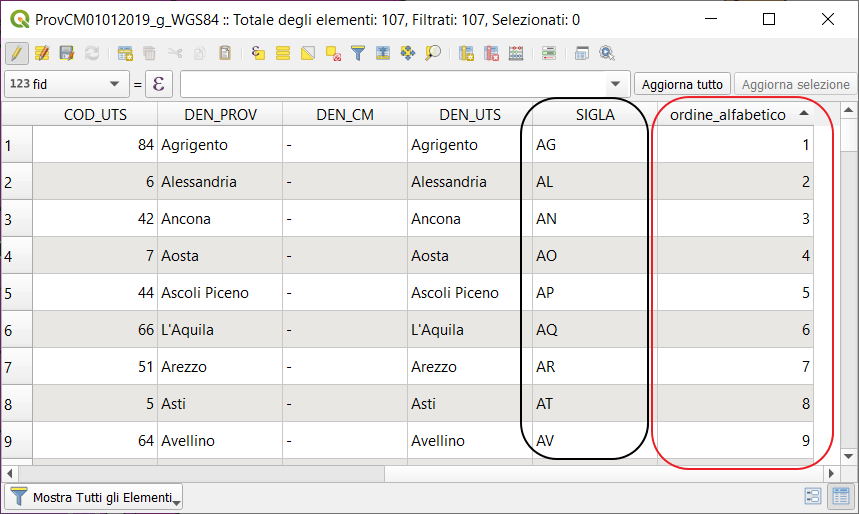 Supponiamo di voler creare un campo numerico e di popolarlo con numeri crescenti in funzione dell’ordine alfabetico (crescente) del campo SIGLA , cioè alla Provincia AG corrisponde 1 e a VV 107:
