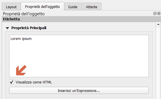 Per fare questo una volta inserito un testo nel layout di stampa bisogna attivare la spunta visualizza come HTML sotto la finestra per l’inserimento dei testi.