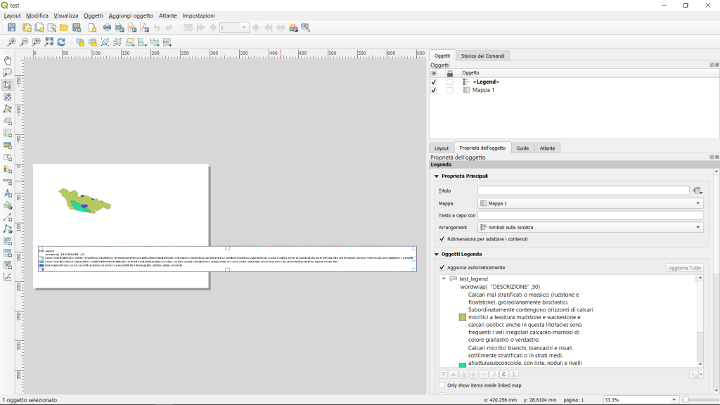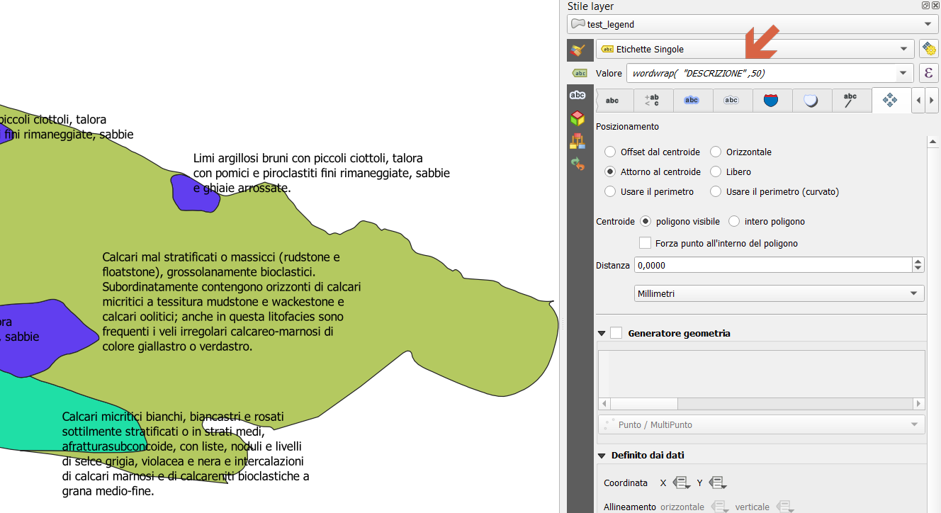 In effetti l’attributo Descrizione delle carte geologiche è abbastanza lungo e se lo utilizzassimo nel compositore di stampe di QGIS, la lettura non sarebbe confortevole e la relativa legenda andrebbe oltre i margine del foglio.