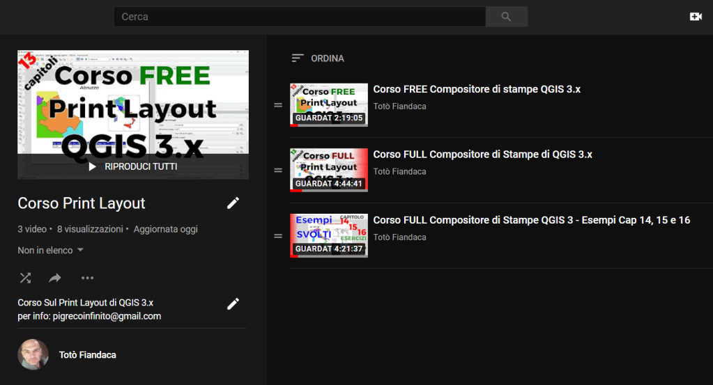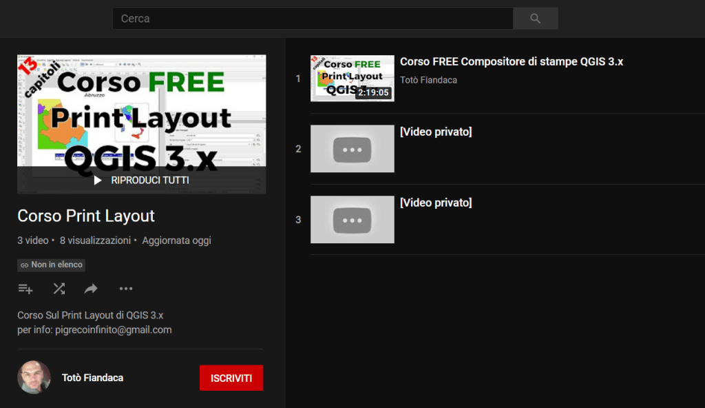 - FULL : le lezioni (#13) sono PRIVATE e la playlist (che contiene tutti i video del corso, FREE e FULL) è visibile a tutti coloro che hanno il link; per i video FREE vale quello descritto sopra (vedi FREE), mentre per il video FULL è visibile solo l’icone e PER USUFRUIRNE occorre richiesta esplicita tramite e-mail. Le lezioni sono teoriche-pratiche, cioè si fa uso diretto di QGIS, con esempi ed esercizi (Sono 13 capitoli più altre tre lezioni con esercizi svolti).