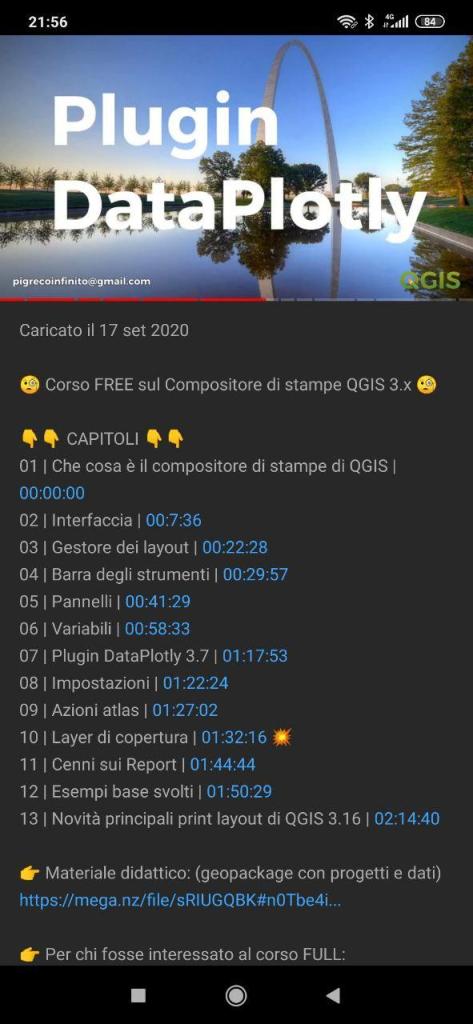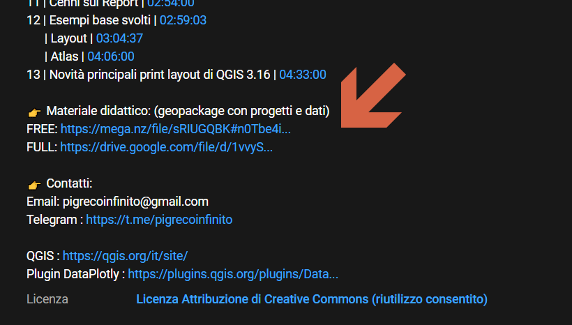 - FREE : il video non ha nessuna restrizione e la playlist (che contiene tutti i video del corso) è visibile a tutti coloro che hanno il link. Le lezioni sono SOLO teoriche, cioè non si fa uso diretto di QGIS, ma solo spiegazioni con molti screenshot (13 capitoli spiegati in circa 2h 20 minuti):
