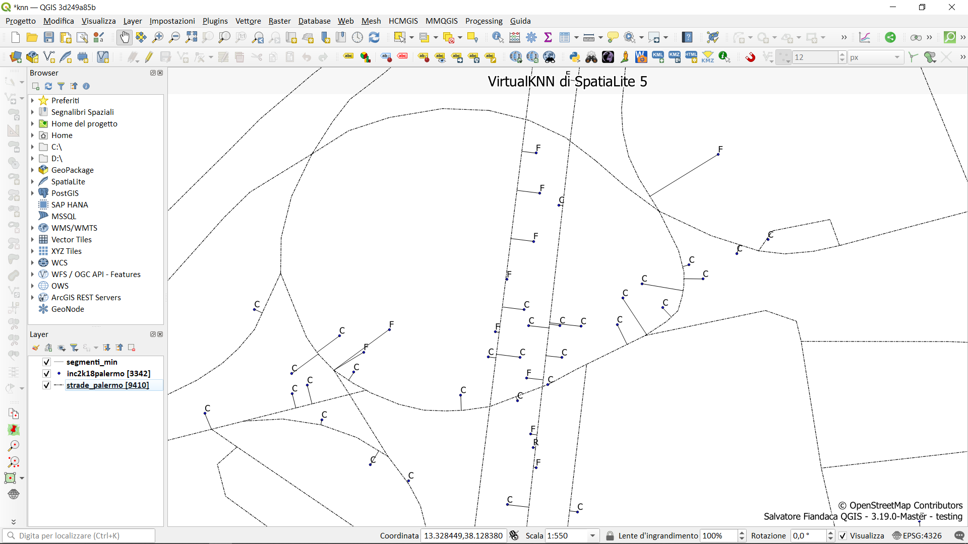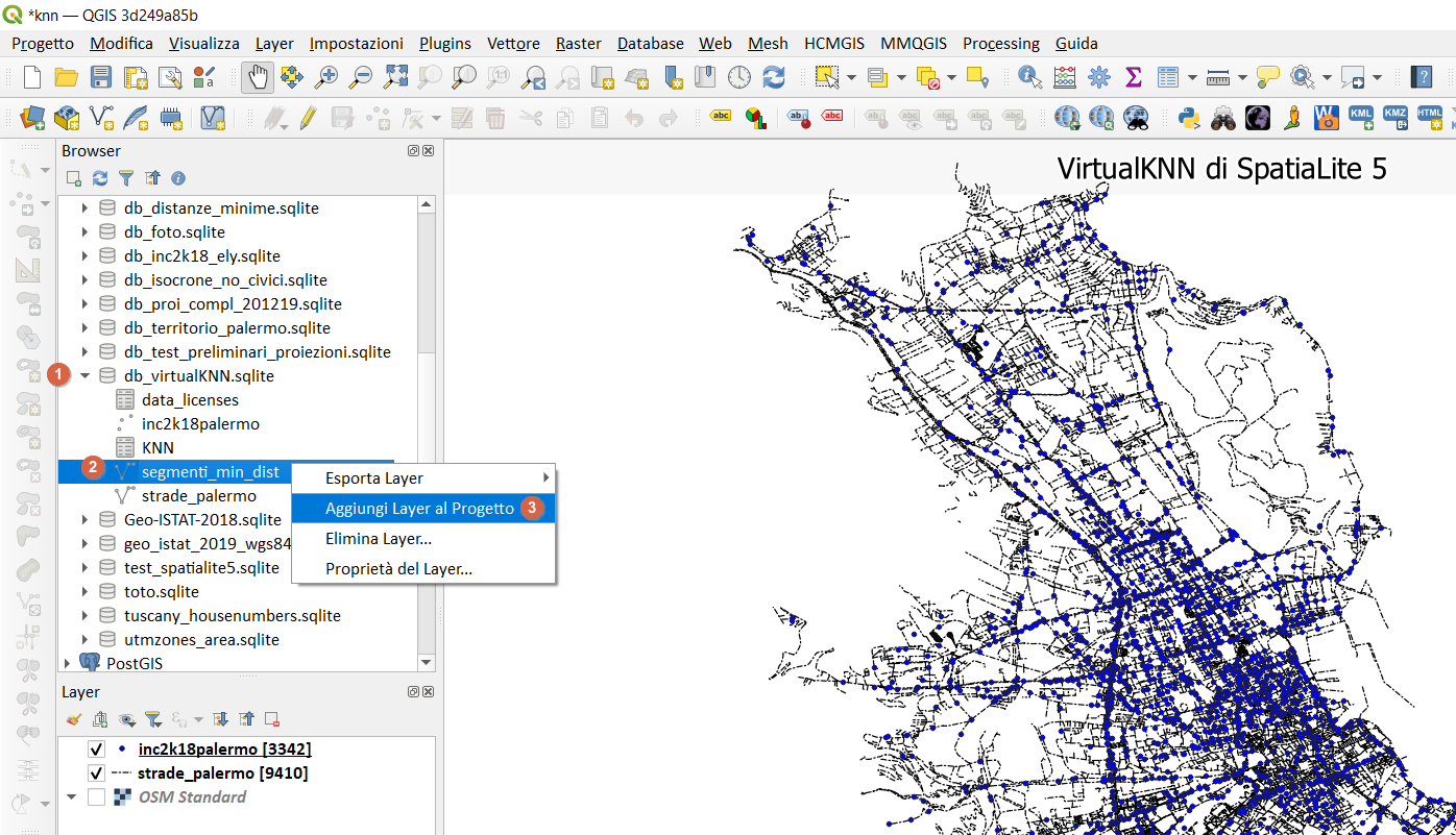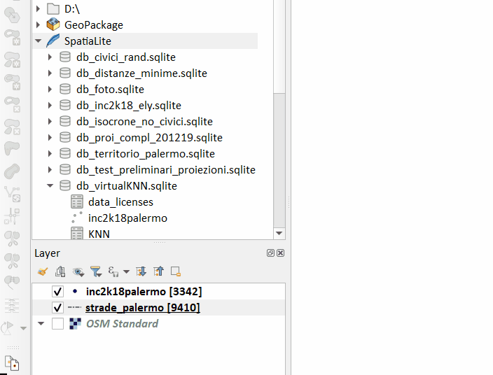 Stesso database, ma questa volta utilizzo solo il layer dei punti inc2k18Palermo per fare un esempio che non ha un senso pratico, ma concettuale: per ogni punto, tracciare i segmenti di minima distanza verso i tre punti più vicini: