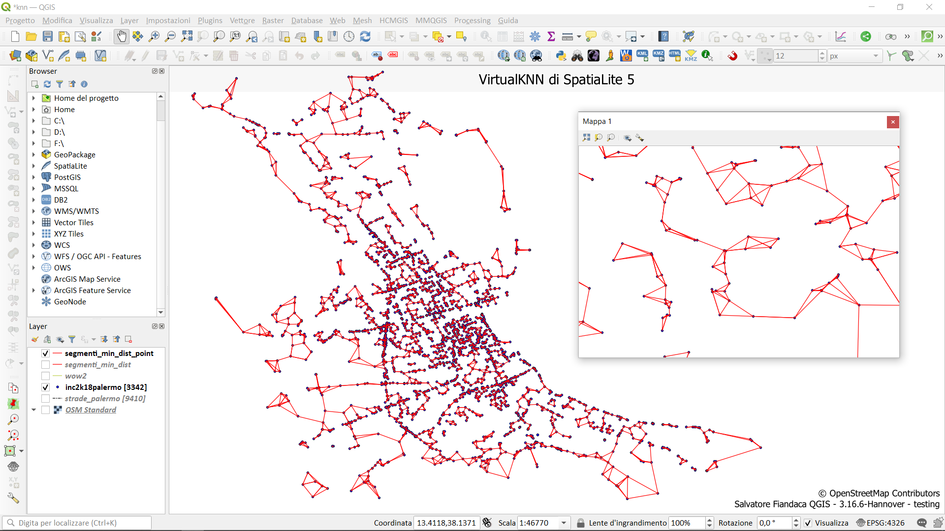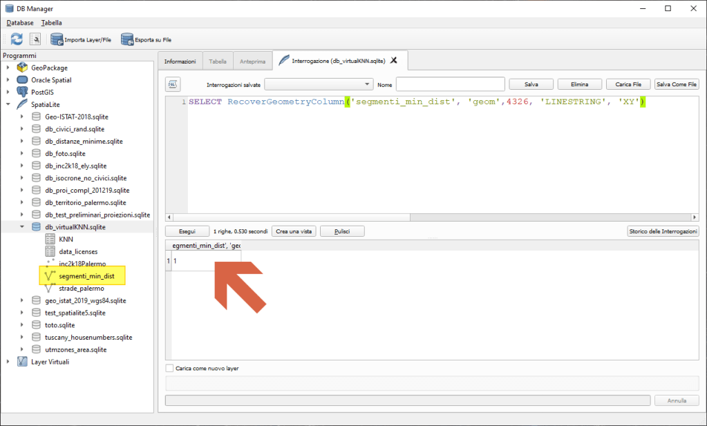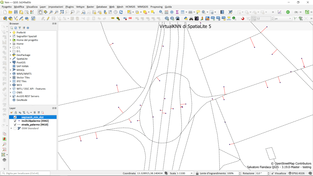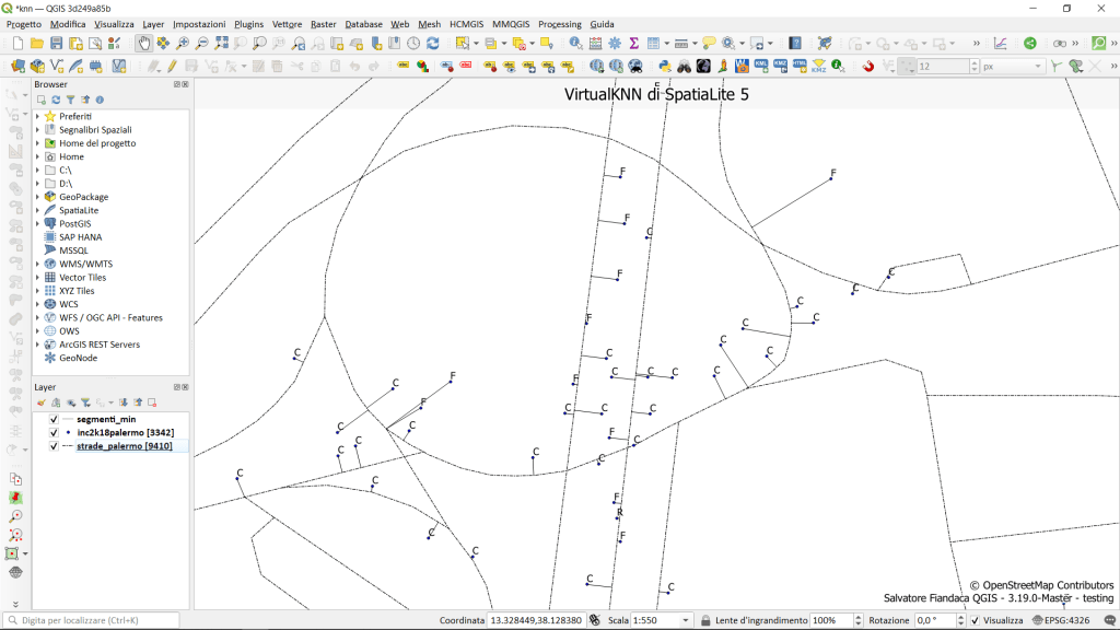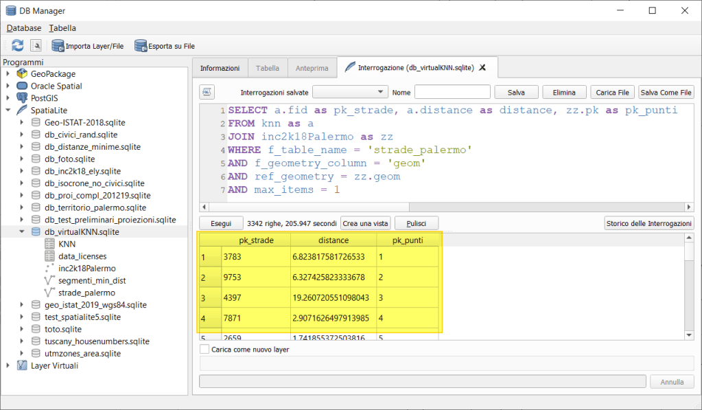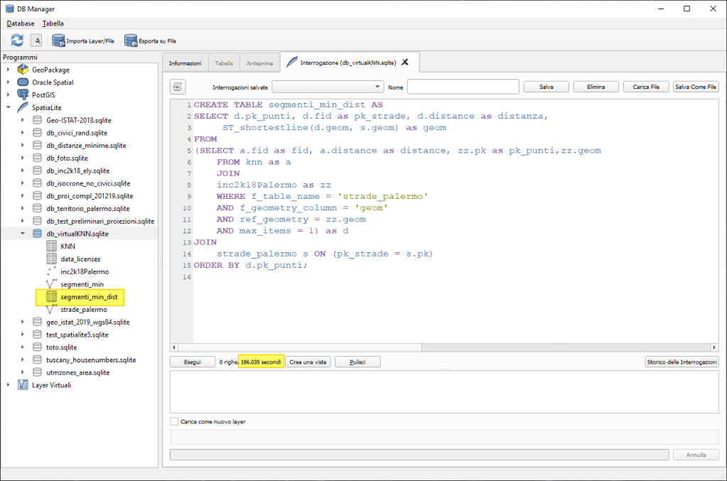 Il layer dei punti contiene 3.342 elementi, mentre il layer degli assi stradali contiene 9.410 elementi; la creazione della tabella finale segmenti_min_dist impiega circa 186 sec, ovvero 0.055 sec (186/3342) per ogni punto (i tempi dipendono molto dalle caratteristiche hardware del PC, il mio è del 2015, un po’ vecchiotto). Come si nota è estremamente veloce la ricerca dei K elementi più vicini e tale prestazioni sono molto utili nei trigger (qui un esempio).