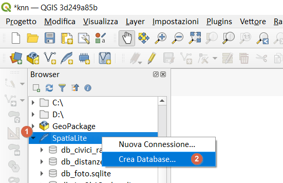 Fatta questa doverosa introduzione, vediamo ora come usare il VirtualKNN (presente in SpatiaLite a partire dalla versione 4.4, QGIS era ferma da anni alla 4.3a) in QGIS e in particolare usando il plugin DB Manager.