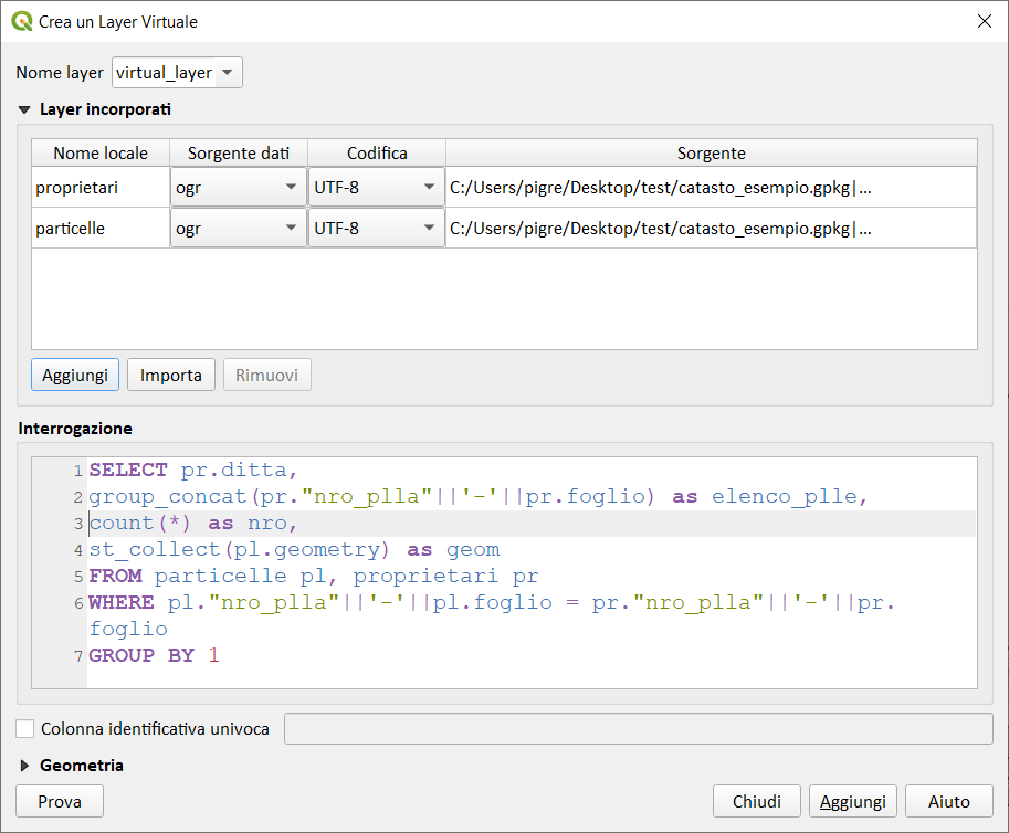 Il layer di copertura dell’atlante deve essere un vettore poligonale, in particolare deve essere un vettore multi-poligonale che raccolga, per ogni Ditta, tutte le particelle in cui è proprietario, la query che materializza il vettore è la seguente (virtual layer):